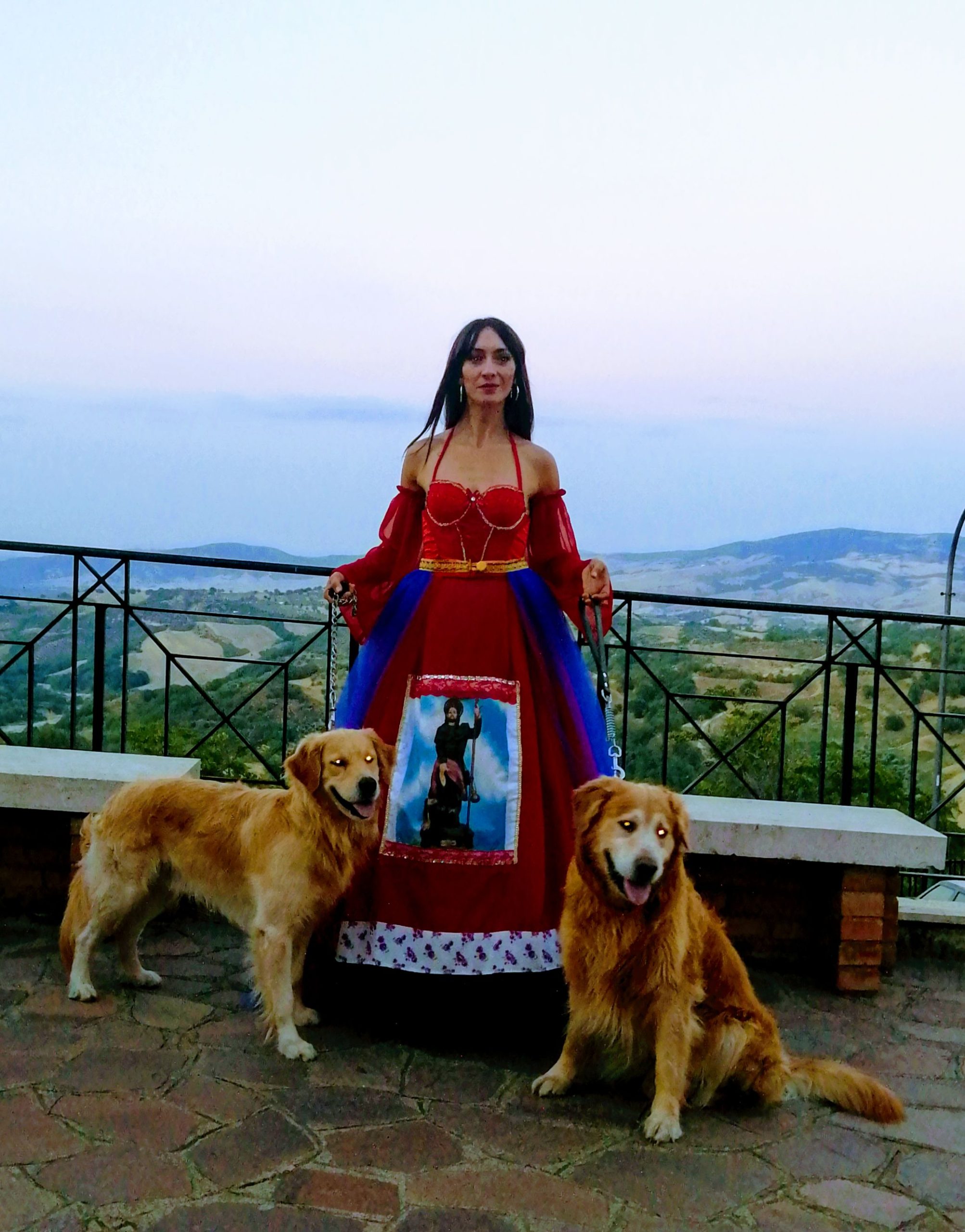Scatti fotografici che hanno immortalato vari abiti tra cui uno dedicato al Santo Patrono di Roccanova San Rocco, tanto gradito dai numerosi concittadini ritornati in occasione dei solenni festeggiamenti, bustier e gonnellone rosso con sopra l’effige del SANTO e poi strati di tulle rossi e blu e bianco i colori della Francia terra da cui proveniva il pellegrino di Montpellier, il velo oro a simboleggiare tutti i preziosi di valore donati negli anni dai devoti Roccanovesi.