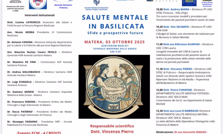 Il convegno “Salute mentale in Basilicata: sfide e prospettive future”, che si terrà il 3 ottobre 2025 presso l’Auditorium Giuseppe Moscati dell’Ospedale Madonna delle Grazie di Matera, rappresenta un importante momento di confronto sulle principali tematiche legate alla salute mentale nella regione.