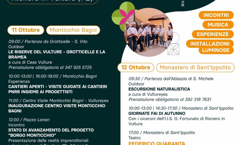 Domenica 12 ottobre, la giornata inizierà alle 9.30 con un’escursione naturalistica ai Laghi di Monticchio, a cura della cooperativa Vultureyes (prenotazione obbligatoria al numero 392/3187631). In occasione delle Giornate FAI d’Autunno, dalle 10.30 alle 13 e nel pomeriggio a partire dalle 14.30, i ciceroni dell’IIS “Giustino Fortunato” di Rionero in Vulture guideranno i visitatori nell’area archeologica del Monastero di Sant’Ippolito, dove alle 17 prenderà forma lo spettacolo “Rispetto Tour – Le radici del futuro” con Federico Quaranta.
