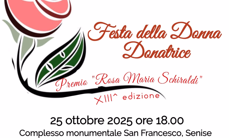 Sabato 25 ottobre alle 18.00, nella sala convegni del complesso monumentale di San Francesco a Senise, si terrà la XIII edizione del premio “Rosa Maria Schiraldi”, promosso dall’Avis locale in occasione della festa della “Donna Donatrice”.