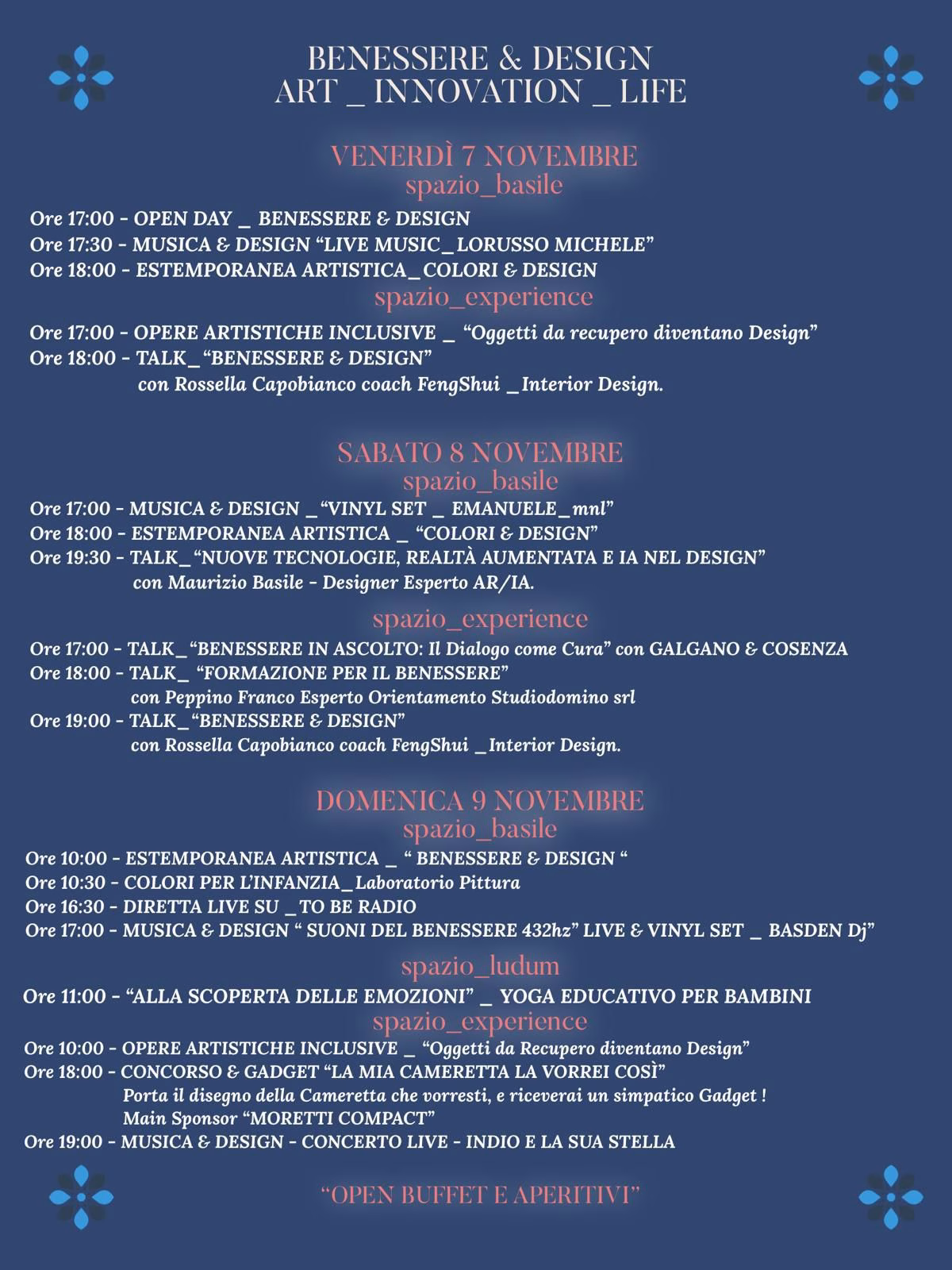 Durante le giornate, si alterneranno talk tematici sull’armonia degli ambienti, con approfondimenti sul Feng Shui, sul progetto innovativo Casa Felice, sulla realtà aumentata, sull’interior design e sul Re-Design come strumenti per creare e ristrutturare spazi domestici e professionali. Non mancheranno laboratori esperienziali dedicati all’infanzia, con attività sui colori e sullo sviluppo sensoriale, dj set con frequenze 432hz, il concerto live di Indio e la sua Stella, e momenti di formazione per il benessere con Peppino Franco, esperto di orientamento di Studiodomino srl. A completare il percorso, riflessioni sul “dialogo come cura” con gli autori Andrea Galgano e Francesco Cosenza, opere artistiche inclusive, e yoga educativo per bambini nello spazio dedicato Ludum.