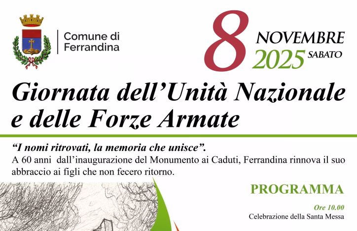 Sabato 8 novembre, a sessant’anni dall’inaugurazione della Villa comunale dedicata ai Caduti in guerra, Ferrandina si prepara a celebrare la Giornata dell’Unità Nazionale e delle Forze Armate con una cerimonia toccante e significativa, all’insegna del tema “I nomi ritrovati, la memoria che unisce.”