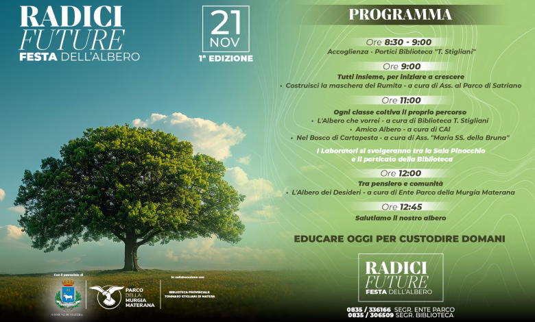 L’Ente Parco della Murgia Materana, in collaborazione con la Biblioteca Provinciale “Tommaso Stigliani”, presenta la prima edizione della “Festa dell’Albero 2025 – Radici Future”, in programma venerdì 21 novembre 2025 a Matera, negli spazi della Biblioteca e nei portici antistanti.