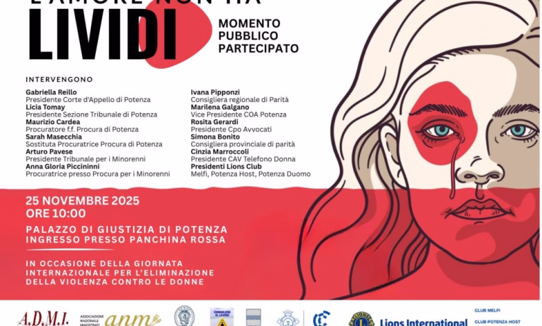 E’ l’evento promosso di concerto dalla consigliera regionale di parità Ivana Pipponzi e dalla presidente della Corte di Appello di Potenza Gabriella Reillo. “L’amore non ha lividi”, questo il titolo, si terrà presso il Palazzo di giustizia – ingresso Panchina rossa – del capoluogo di regione, il 25 novembre (ore 10), Giornata internazionale per l’eliminazione della violenza sulle donne.