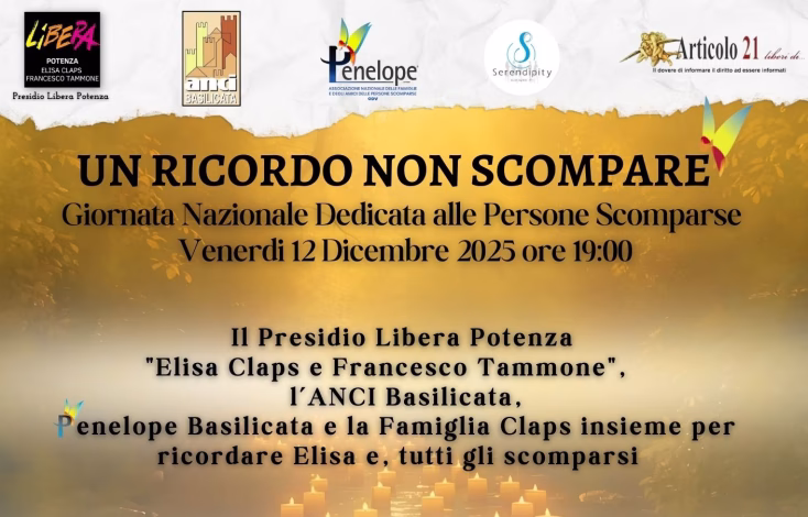 ๐ฝ๐๐๐๐๐ ๐ 12 ๐ ๐๐๐๐๐๐๐ 2025, ๐๐๐๐ ๐๐๐ 19:00, il Presidio Libera Potenza โElisa Claps e Francesco Tammoneโ insieme con Penelope, lโAnci Basilicata, lโAssociazione Serendipidy e Articolo21 ricordano tutti gli scomparsi per mantenere viva la memoria di chi non รจ piรน tornato e offrire supporto a chi ancora attende risposte.