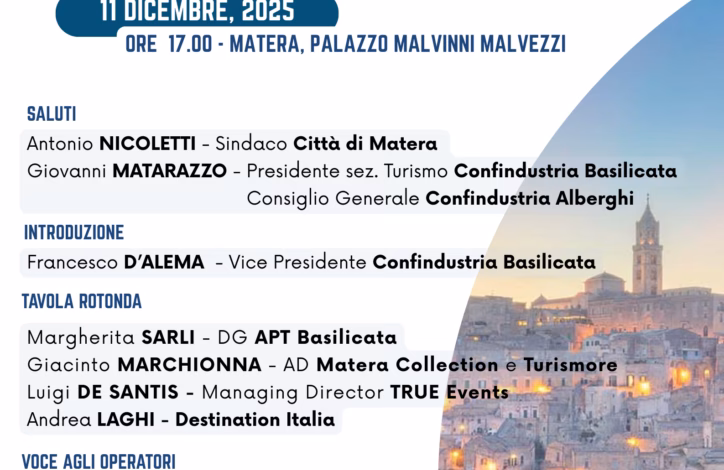 Dopo i saluti istituzionali del sindaco, Antonio Nicoletti e del presidente della sezione Turismo, Giovanni Matarazzo, l’introduzione ai lavori con la presentazione degli obiettivi dell’iniziativa sarà affidata al vicepresidente di Confindustria Basilicata, Francesco D’Alema.