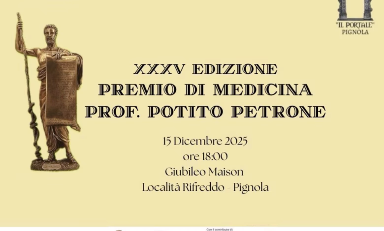 Lunedì 15 dicembre alle ore 18.00, presso il “Giubileo Maison” di Pignola, si terrà la cerimonia di premiazione della XXXV edizione del Premio di Medicina “Potito Petrone”, riconoscimento intitolato alla memoria del professor Potito Petrone, stimato medico e figura di riferimento per la comunità lucana.