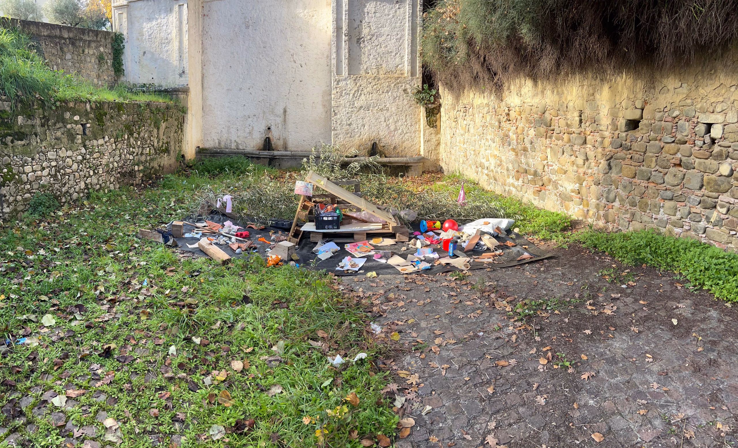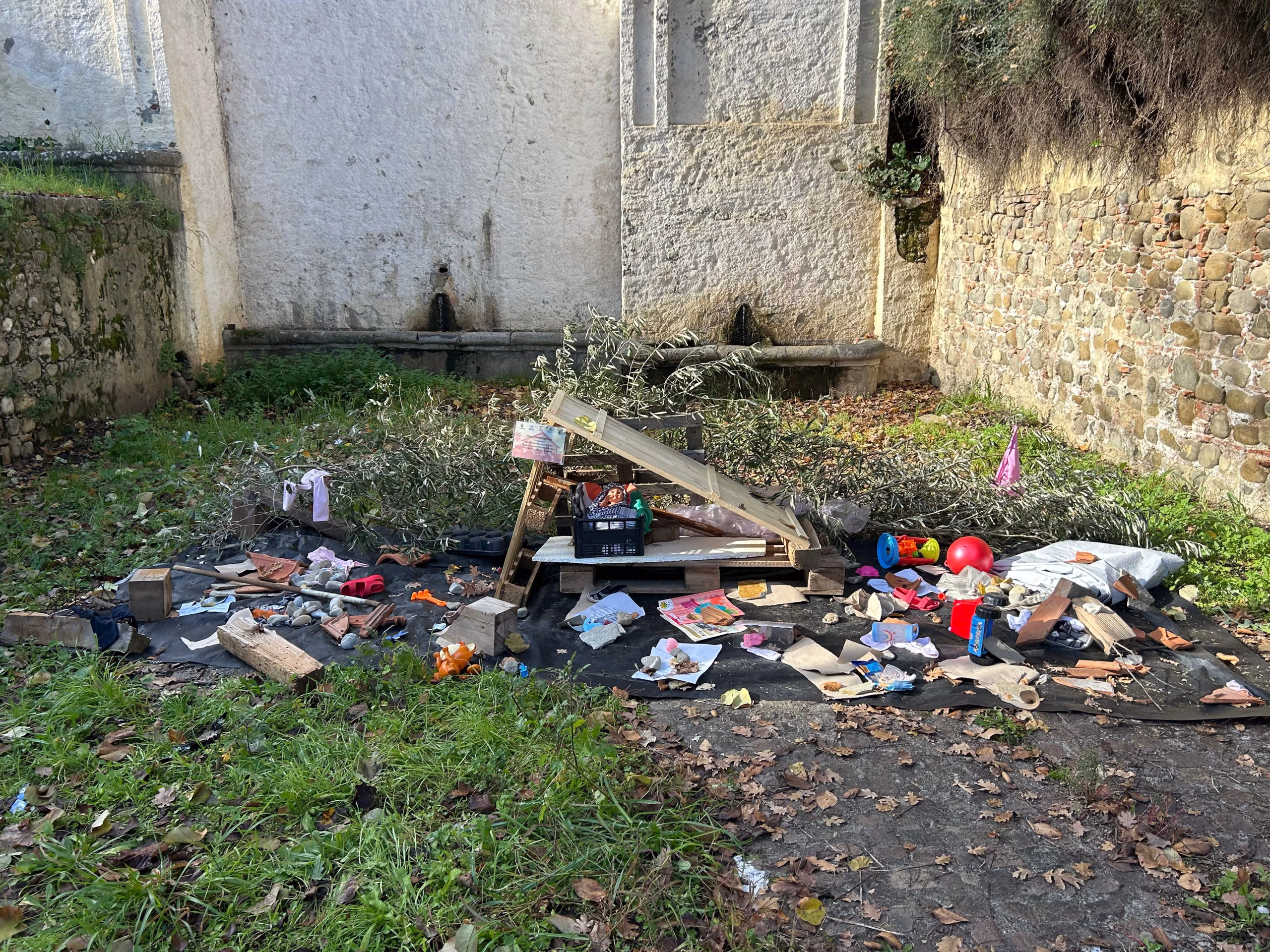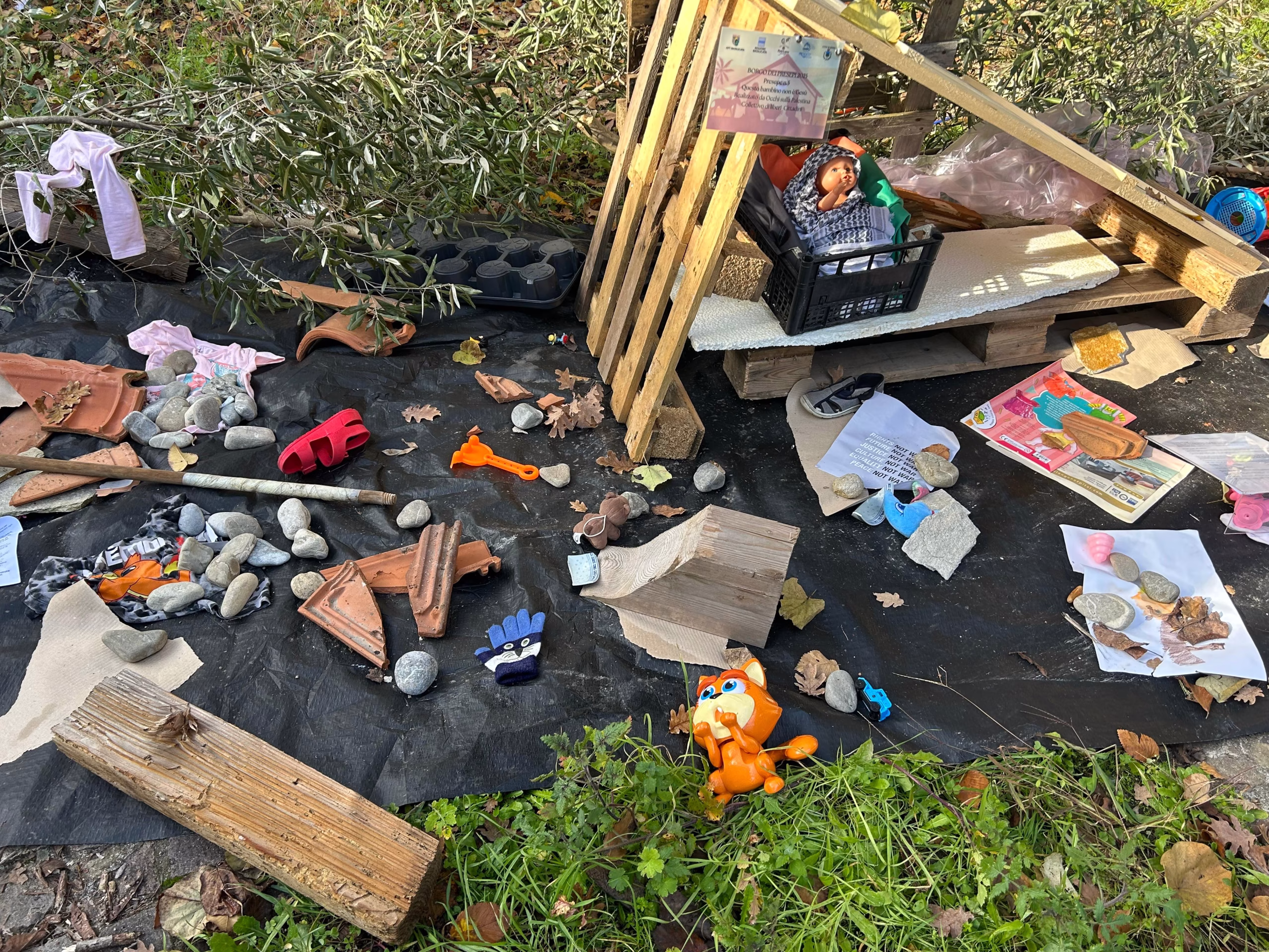 Il Bambin Gesù, rappresentato da una bambola, non giace in una mangiatoia di paglia, ma in una cassetta di plastica, simbolo di precarietà e povertà. Attorno, foglie d’ulivo e frammenti di vita quotidiana — scarpe, fogli, giochi spezzati — parlano di fragilità, ma anche di resistenza.