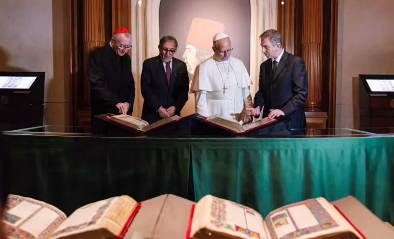 Durante la permanenza, il Papa ha osservato con attenzione il prezioso manoscritto e ha compiuto anche un gesto simbolico, scoprendo la statuina del Bambino Gesù nel presepe predisposto in una delle sale.