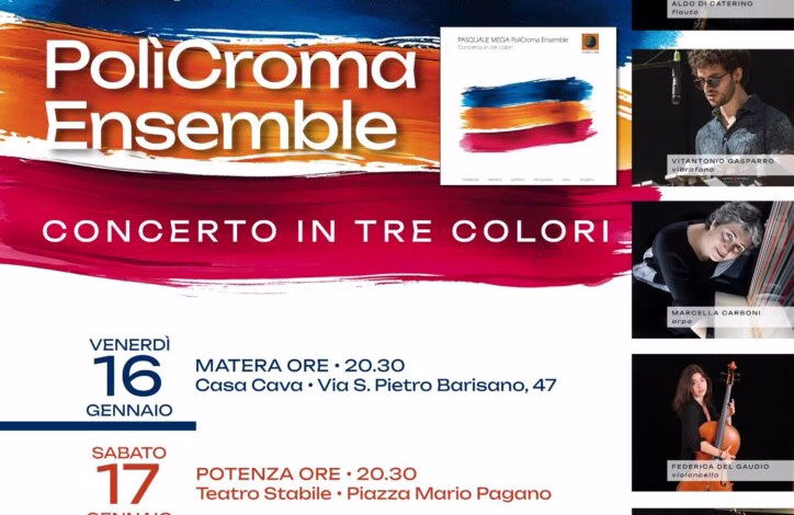 Matera, che ospiterà l’esibizione a Casa Cava, in via San Pietro Barisano 47, sarà la prima tappa di una mini tournée che proseguirà sabato 17 gennaio a Potenza, nel Teatro Stabile, e si concluderà domenica 18 gennaio a Martina Franca, nel Piccolo Teatro Cappelli, sempre alle 21, per la presentazione di “Concerto in tre colori”, il nuovo cd pubblicato nello scorso ottobre dall’etichetta Dodici Lune che Pasquale Mega ha inciso con il PolìCroma Ensemble. L’inizio è fissato per tutte e tre le serate alle 21.