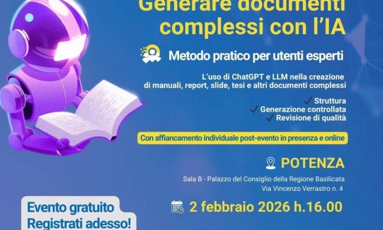 Si terrà lunedì 2 febbraio 2026, alle ore 16:00, presso la Sala B del Palazzo del Consiglio della Regione Basilicata, il corso di formazione gratuito “Generare documenti complessi con l’Intelligenza Artificiale: un metodo pratico, strutturato e subito applicabile”. Promosso nell’ambito del programma “Dritti al Punto”, progetto selezionato e sostenuto dal Fondo per la Repubblica Digitale – Impresa Sociale, è co finanziato dalla Regione Basilicata per la promozione dell’innovazione digitale e dell’uso consapevole dell’Intelligenza Artificiale.