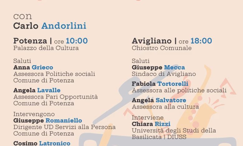 Ad Avigliano invece interverranno il sindaco, Giuseppe Mezza, e Fabiola Tortorelli e Angela Salvatore, rispettivamente assessore alle Politiche sociali e alla Cultura e, Chiara Rizzi, docente presso il Dipartimento per l’Innovazione Umanistica Scientifica e Sociale dell’Università di Basilicata. per il Dipartimento per l’Innovazione Umanistica Scientifica e Sociale dell’Università di Basilicata.