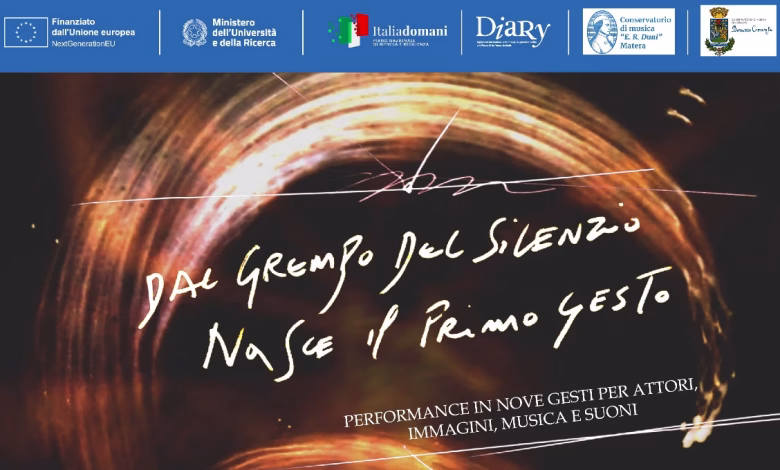 Il Conservatorio di Musica “E.R. Duni” di Matera, in collaborazione con il Conservatorio “D. Cimarosa” di Avellino, presenta il 13 e 14 febbraio, alle ore 20.00, presso lo Spazio CasaTeatro (Vico XX Settembre 2-6, Matera), la performance “Dal grembo del silenzio nasce il primo gesto – Azione in nove gesti”, produzione realizzata nell’ambito del progetto PNRR D.I.A.R.Y. – Digital and International Arts through Augmented Reality and Research for young students (artists).