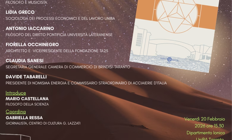 Per un nuovo pensiero agente nel territorio” – Cacucci editore. L’evento si terrà venerdì 20 febbraio 2026 a partire dalle ore 15.30, presso il Dipartimento Jonico UNIBA, via Duomo 259, a Taranto.