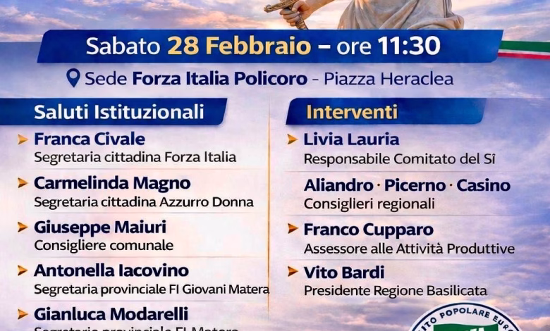 Forza Italia Basilicata, come anticipato nella conferenza stampa dello scorso 31 gennaio, inizierà da questo fine settimana a promuovere degli incontri sui territori per presentare leragioni del Sì al prossimo referendum sulla riforma della giustizia che si terrà il 22 e il 23 marzo 2026.